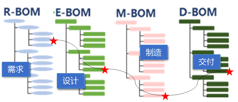??下圖中小紅星代表了我們要找的零件的一個具體信息,它在不同的業務階段可能在不同的“樹杈”上,但這四棵不同的“樹”之間可以通過固定的邏輯進行溯源,因為它們的本質都是產品的分解架構,只是視角不同而已。如此一來,我們要找的目標零件信息就不再是數據海洋中漂流的孤島,而是被X-BOM這棵大樹緊緊串聯在一起,不論漂到哪兒,都能找到自己的“前世今生”。